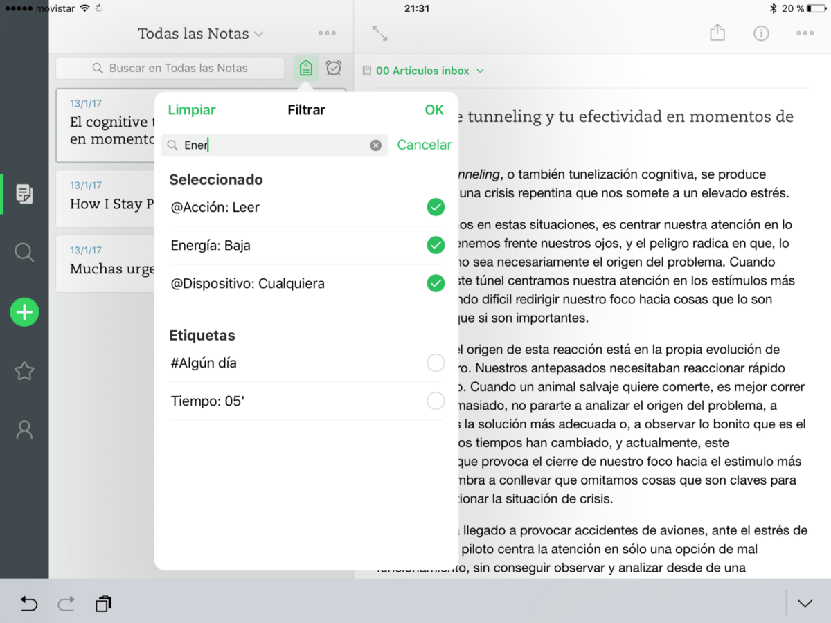 Otro ejemplo lo tenemos en la siguiente captura de pantalla. La nueva versión de Evernote para IOS permite seleccionar varias etiquetas a la vez para aplicar mejores criterios de filtrado.