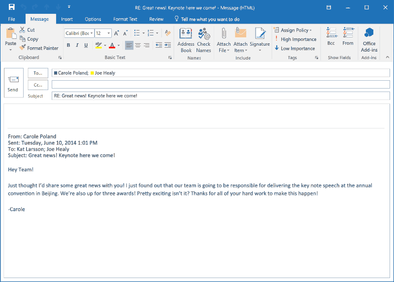 Las menciones hacen que la colaboración en el correo electrónico sea rápida y fácil. Puedes mencionar a otras personas para que tomen acción directamente en el cuerpo del correo electrónico que estés redactando. Para que las menciones funcionen, previamente debes tener almacenado el contacto en tu agenda de contactos de Outlook.
