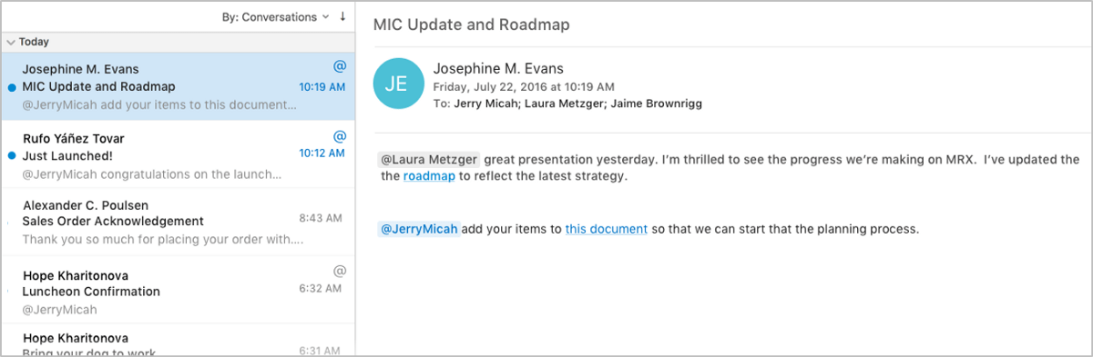 Además de ayudarte a conseguir la atención de otras personas, las menciones también te ayudan a saber lo que otras personas te han pedido que hagas. Microsoft Outlook, agrega un símbolo @ en los mensajes en los que te han mencionado para que puedas ver a simple vista que correos electrónicos requieren de ti una acción o tu atención.