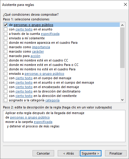 Como he mencionado anteriormente, Microsoft Outlook facilita el trabajo de crear y mantener reglas gracias a su asistente, así pues, una vez creada la regla en el paso número 1, tendrás que seleccionar las condiciones que quieres que se reproduzcan para poder ejecutar la regla.