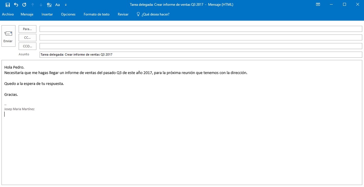 Puedes crear una regla de mensajes salientes con una configuración específica para que cuando envíes un correo electrónico a cualquier persona y en el asunto pongas la palabra “Tarea delegada”, por ejemplo, Outlook envíe de forma automática una copia de ese correo a la bandeja de entrada de tu aplicación de tareas. Tan solo tendrás que tener en cuenta de incluir la palabra “Tarea delegada” en el asunto del correo electrónico. Veamos un ejemplo: