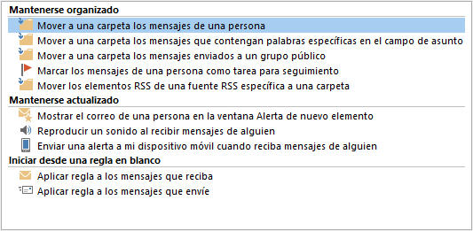 Microsoft Outlook, incluye un asistente muy sencillo de utilizar, que puede ayudarte a crear nuevas reglas en función de lo que necesites.