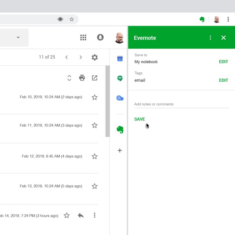 El complemento de Evernote para Gmail, te permitirá seleccionar los correos electrónicos importantes de tu bandeja de entrada, y colocarlos en notas. Si ya utilizas asiduamente Evernote, sabrás que una «simple nota» puede proporcionarte más potencia de la que crees. Organizar, editar, añadir adjuntos, subrayar, etiquetar, añadir indicaciones a pdf o imágenes…. En definitiva, lo que inicialmente era un correo electrónico, ha pasado a ser un documento completo con información relevante, importante y de utilidad.