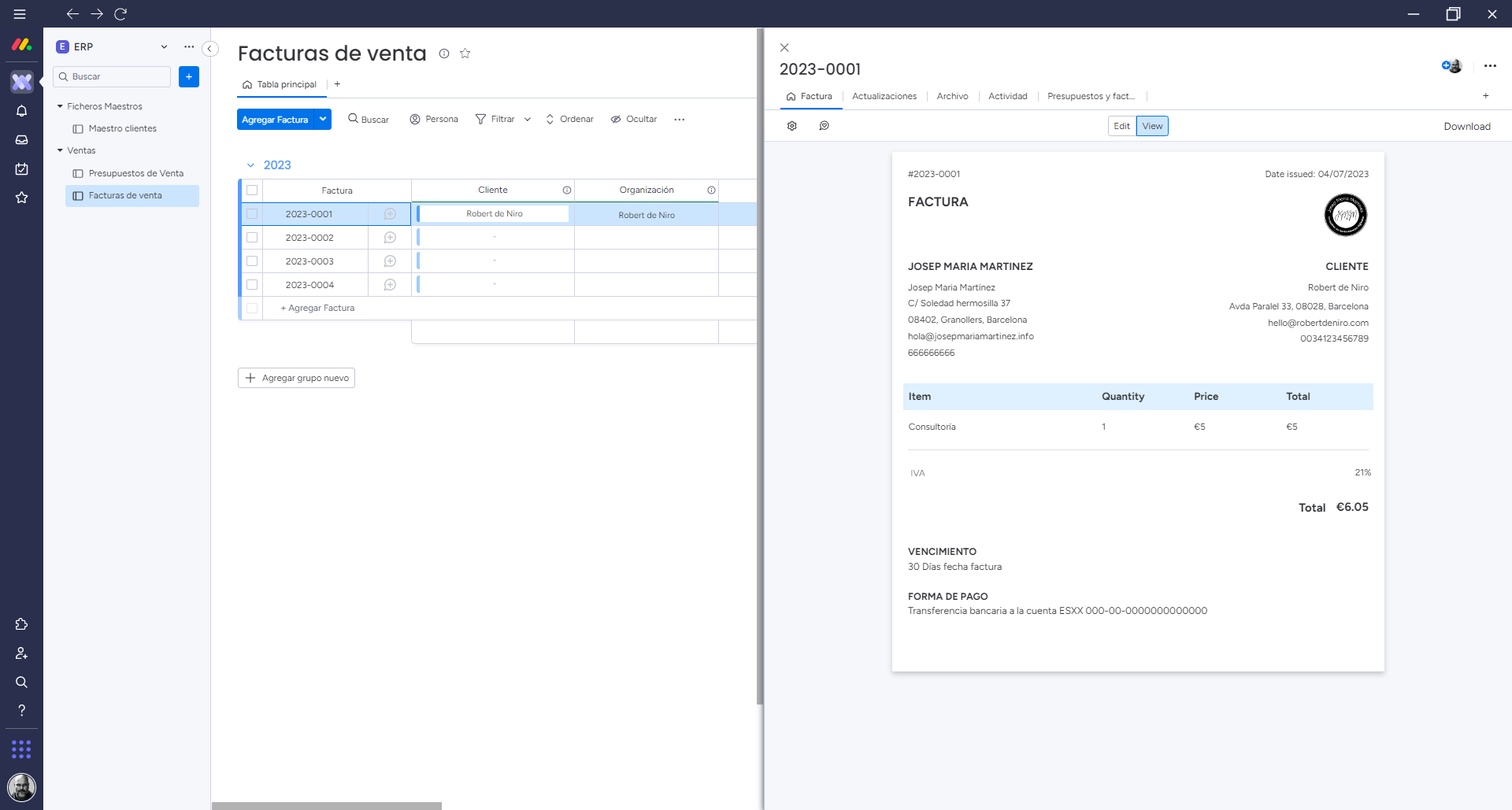 De hecho una de las cosas que me ha dejado muy loco al ver como funciona en Monday.com y de lo que todavía me estoy intentando recuperar, es que Monday.com permite hacer presupuestos y facturas, (si!, como lo lees), por lo que sin quererlo, puede llegar a convertirse en un mini programa de presupuestos y facturación para muchos Freelances y autónomos que hacen sus facturas en Excel. Todavía estoy alucinando con esto!!! va, aquí te dejo una imagen.