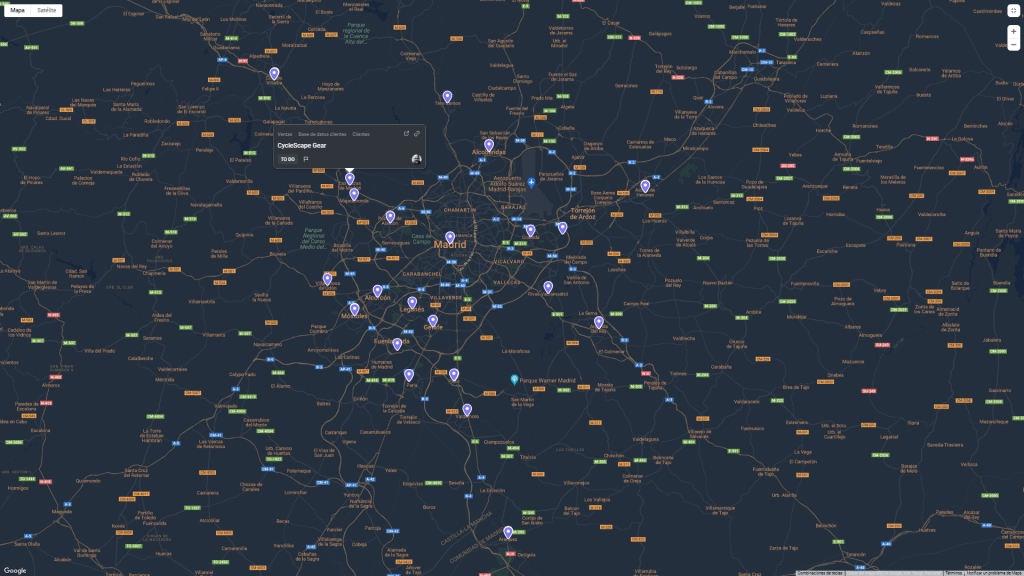 Piensa en poder mirar un mapa interactivo y ver tus clientes y posibles clientes. Puedes moverte por el mapa, acercarte y al hacer clic en un cliente, ver su información.