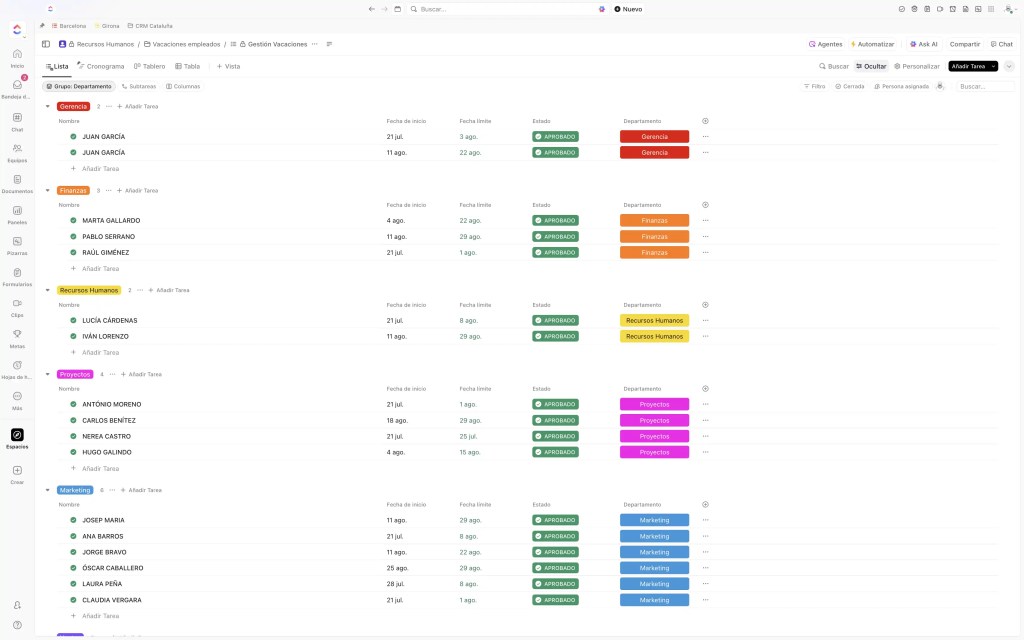 Hemos visto que Laura pudo salvar el caos del año anterior organizando las vacaciones mediante correos y Excel, gracias a que esta vez lo hizo con ClickUp y la vista cronograma. Veamos en mayor detalle como lo hizo Laura.