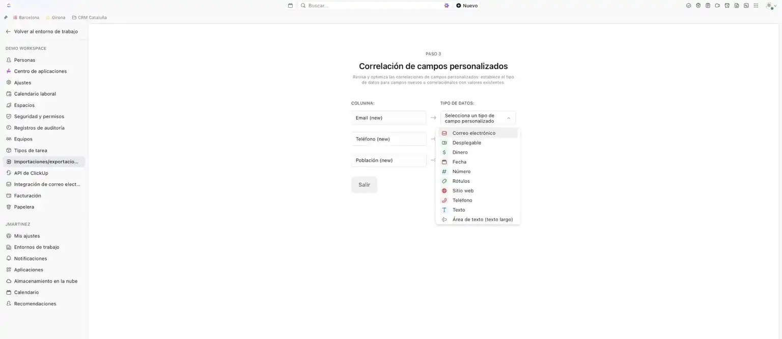 Venga!!! ya casi lo tenemos. Pulsamos el botón «Import into ClickUp» y ahora ClickUp nos dejará escoger el tipo de campo que queremos utilizar para los campos personalizados.